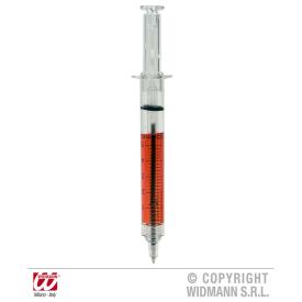 Penna a forma di siringa con liquido rosso all’interno. Materiale plastico.