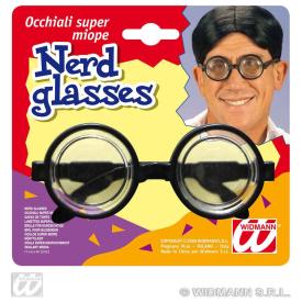 Occhiali supermiope con lenti a fondo di bottiglia trasparenti con montatura nera in plastica.
