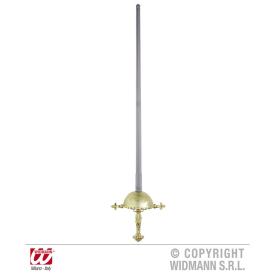 Spada modello fioretto lusso con coppetta ad incastro di colore oro satinata e lama grigia. Materiale plastico adatto anche ai bambini. Lunghezza totale 50cm.