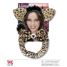 Set da leopardina che comprende: 1 cerchietto nero in plastica con orecchie leopardate brilantini trasparenti e peletto nero, 1 papillon leopardato con gemmina trasarente centrale a forma di cuore applicabile tramite il pratico elastico bianco in dotazione, 1 codina leopardata con finale di pelliccetta nera applicabile tramite il pratico elastico nero in dotazione. Misura unica.