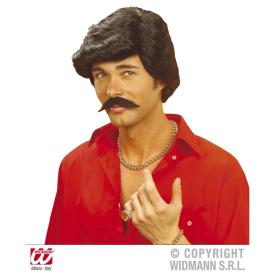 Parrucca modello Casanova da uomo con taglio anni ‘70 / ‘80 color moro con baffi del medesimo colore. Non piastrabile ne fonabile. Media qualità. Misura unica.