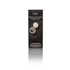 Kit ricostruzione sopracciglia composto da una polvere (fibre) di seta, una cera per modellare (base mango, karitè e burro di cacao) e un pennellino a doppia punta per l'applicazione di entrambi i prodotti.